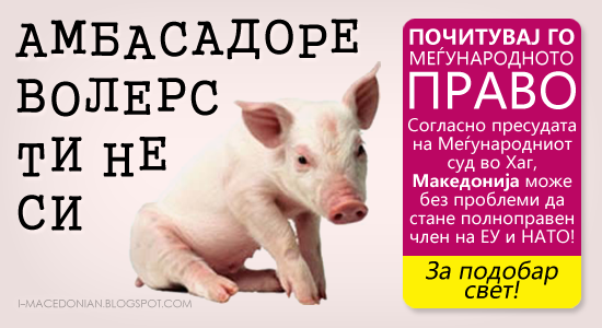 ![]() И ТИ НЕМОЈ ДА СИ СВИЊАДеновиве во ек е кампањата на Американската амбасада во Скопје, со која Uber-луѓето кои недостатокот на оправдани каузи го компензираат со бомби и измами, со омаловажувачки тон не` подучуваат нас „глупавите“, дека не сме свињи, папагали и змии. На еден билборд во Скопје стои напишано: „Ти не си [прасе]. Почитувај го законот...“ Од ова поапсурдно не би можело да биде. Кога човек кој самиот не го почитува законот праќа ваква порака повеќе од јасни се неговите „искрени“ намери. Имено амбасадорот на САД во Македонија, Волерс, кој сега не` учи оти треба да го почитуваме законот, не покажа ниту ронка почит кон меѓународното право и кон одлуката на Меѓународниот суд во Хаг, според која Грција не смее да ја блокира Македонија во нејзините напори за зачленување во ЕУ и НАТО. По тој повод Волерс изјави (Сител, 05.12.2011 - 14:22): Македонија ќе може да стане членка на алијансата, кога ќе се реши прашањето со името, а како резултат на заклучокот од самитот во Букурешт во 2008, изјави американскиот амбасадор Пол Волерс, по донесувањето на пресудата во Хаг. Замислете, човек кој сам не го почитува меѓународното право, сега нас подучува дека не треба да сме свињи и да ги почитуваме законите. Ние ги почитуваме законите господине Волерс, вие не ги почитувате со тоа што влезот на мојата земја Македонија го држите барикадиран и условен од непринципиелното и незаконско барање за промена на името! Затоа со написов му упатуваме порака во нему својствен стил и му порачуваме дека не само што не сме свињи и ги почитуваме законите, туку дека и тој не треба да биде свиња и уште веднаш да започне да го почитува меѓународното право. Изменето од mungos80 - 20.Март.2012 во 15:05 |